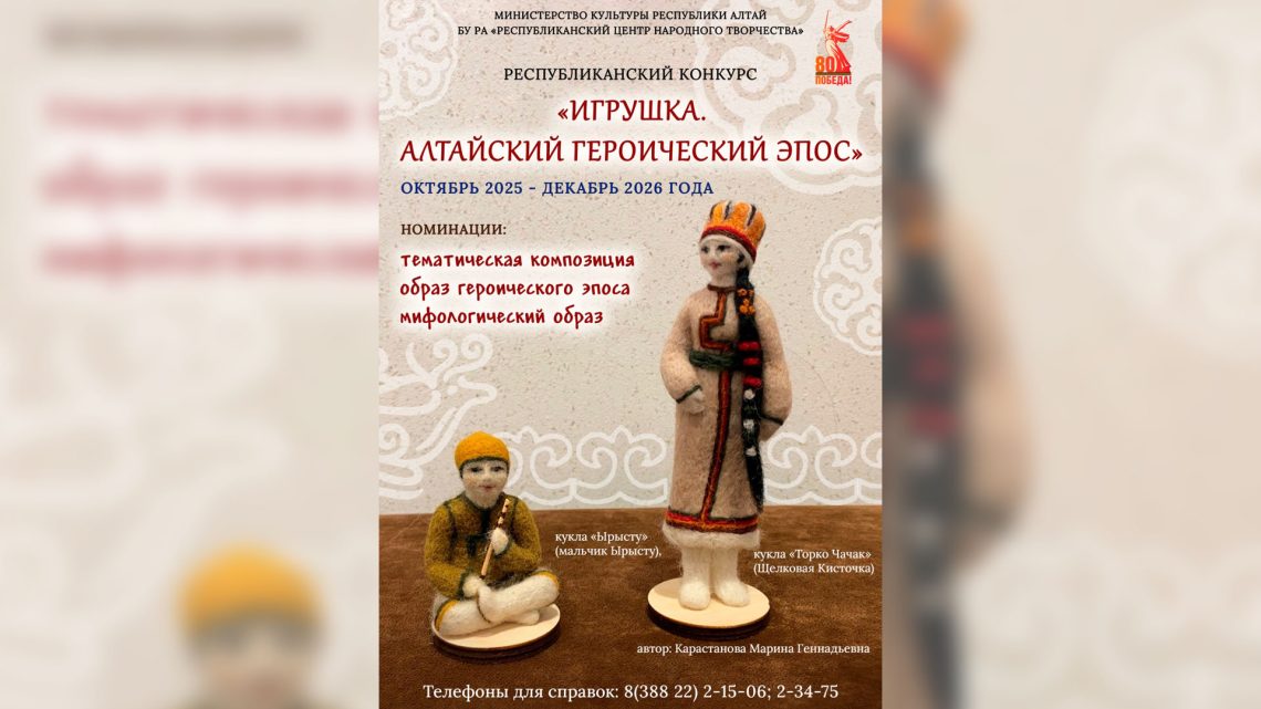 Республиканский конкурс «Игрушка. Алтайский героический эпос» проводится с октября 2025 года по декабрь 2026 года (далее -Конкурс). Конкурс приурочен к юбилейным датам известных сказителей Горного Алтая Николая Улагашевича Улагашева и Алексея Григорьевича Калкина Учредитель Конкурса – Министерство культуры Республики Алтай. Организатор Конкурса – Бюджетное учреждение Республики Алтай «Республиканский … Читать далее Стартовал республиканский конкурс «Игрушка. Алтайский героический эпос»