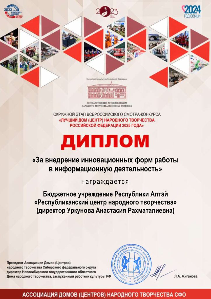 Еще два учреждения отмечены специальными дипломами в этой номинации: дипломы «За внедрение инновационных форм работы в информационную деятельность» присуждены Бюджетному учреждению Республики Алтай «Республиканский центр народного творчества» (Республика Алтай) и Государственному бюджетному учреждению «Республиканский центр народного творчества и досуга» (Республика Тыва).