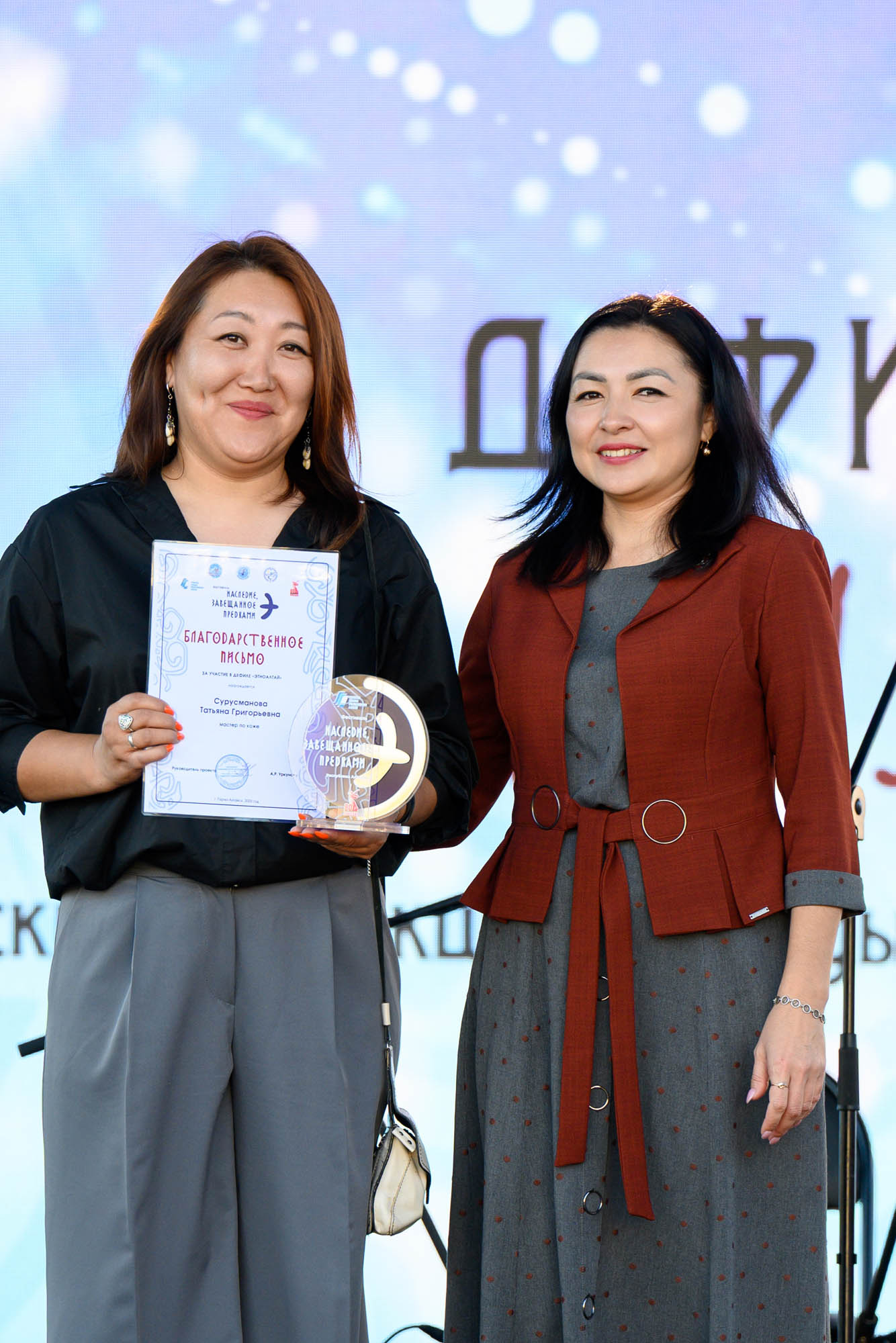 Благодарим за помощь в организации и ведении мероприятия: бизнес-тренера, директора по маркетингу Усадьбы «Сокол» Вячеслава Геннадиевича Мерлушкина, руководителя контент-центра Правительства Республики Алтай Динару Юрьевну Кичинекову, «Народный» вокально-инструментальный ансамбль «Эре-Чуй», концертмейстера, музыканта, преподавателя Хакасского колледжа искусств Александру Пирлей, участника «Образцового» ансамбля «Таҥдак» Аргымай Саланханов, студентов Колледжа культуры и искусства Республики Алтай им.Г.И.Чорос- Гуркина Эркем Бельчеков, Урсул Малчанов, Дмитрий Эзен, Театр моды и танца «ALAS», руководитель, постановщик Солунай Торбогошева, Студиию танца «Алтын-Тана», руководитель Заслуженный работник культуры Российской Федерации Анжелика Молчоева, «Народный» хореографический коллектив «Наследие», Горно-Алтайский педколледж им. В.А. Сластёнина, руководитель Анастасия Белозерцева, студенческий театр моды «Шелковая кисточка» ГАПК им.М.З. Гнездилова, руководитель Елена Кормацких, Колледж культуры и искусства Республики Алтай имени Г.И. Чорос-Гуркина, директор Елена Ластаева, заслуженную артистку Республики Алтай Ирину Кензину, артистов Центра Культуры Майминского района Дергелей Санину и Арину Тахтаеву, солистку вокальной студии «Гравитация» Городской Дом Культуры Горно-Алтайска Аяулым Токсанова, Тимуру Кыдыкову и МБОУ «Средняя школа №7 г.Горно-Алтайска».