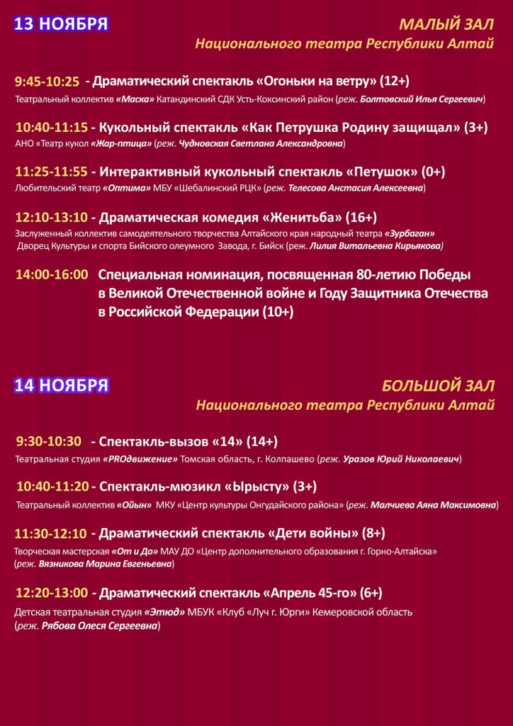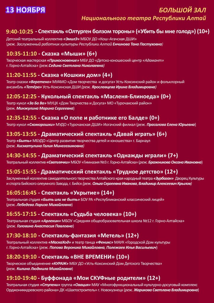 9:40-19:40 – конкурсная программа (Категория — от 5 до 13 лет, Категория —  от 14 до 22 лет) (Большой зал, Национальный театр Республики Алтай)