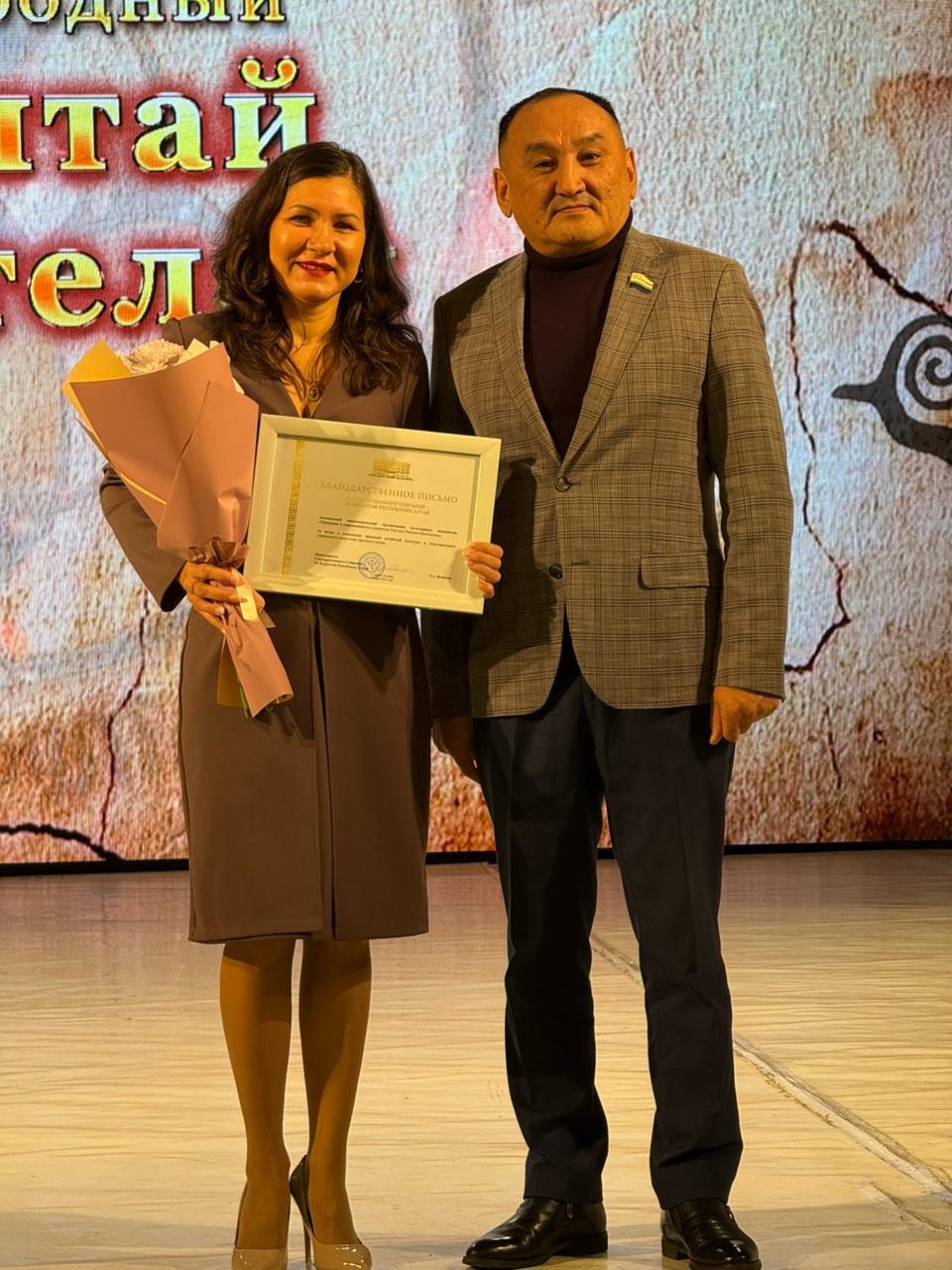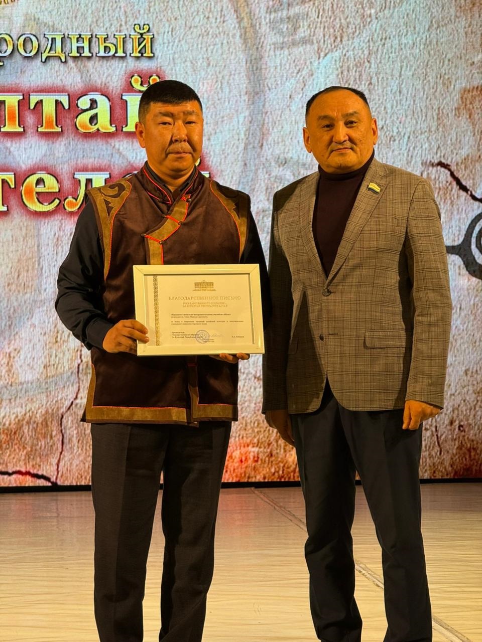 На торжественном открытии Международного курултая сказителей Благодарственные письма Государственного Собрания Эл-Курултай Республики Алтай за вклад в сохранение традиций алтайской культуры и популяризацию уникального искусства горлового пения вручены: