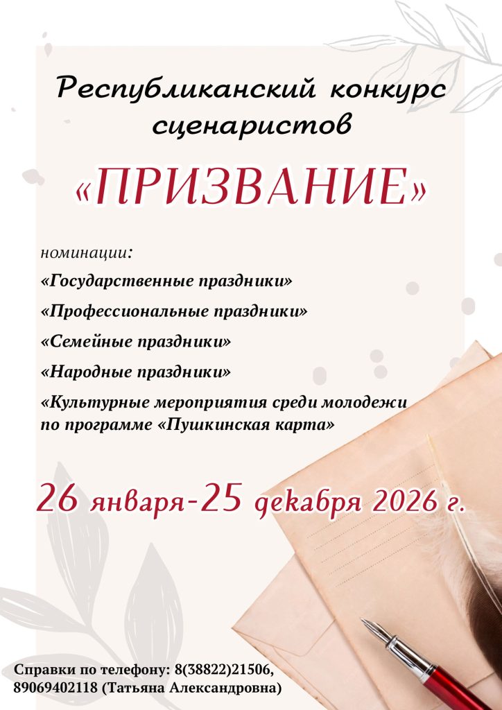 С 26 января по 25 декабря 2026 года пройдет республиканский конкурс сценаристов «ПРИЗВАНИЕ», посвященный 35-летию со дня образования Республики Алтай, 270-летию вхождения алтайского народа в состав Российского государства и Году единства народов России (далее – Конкурс).