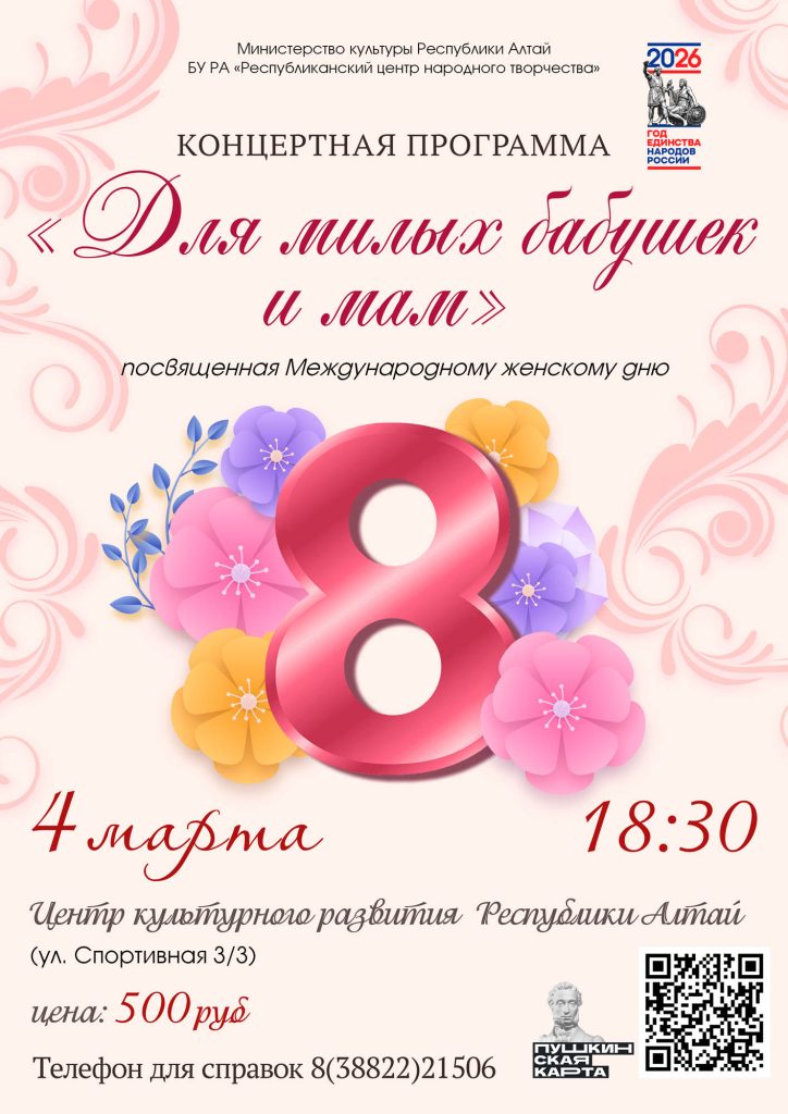 4 марта, в преддверии Международного женского дня юные артисты образцовых и народных самодеятельных коллективов, обучающиеся детских школ искусств, детских музыкальных школ представят праздничную концертную программу «Для милых бабушек и мам».
